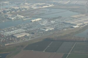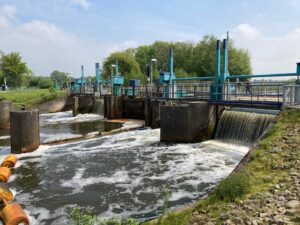 Nee, geen Engelse ‘trap’ maar een echte Hollandse trap om te zorgen dat de vissen ongehinderd langs die sluis konden migreren. Echt weer een ingenieus stukje ecologisch aanlegwerk, zoals je op de foto kunt zien loopt de ‘vis-trap’ gewoon als een lint door het landschap om de sluis heen, met steeds kleine stukjes verval. Op de luchtfoto ziet de zuiveringsinstallatie er wat lelijk uit, maar vanaf de grond zie je daar niets van en is het gewoon een mooi, rustig natuurgebied.